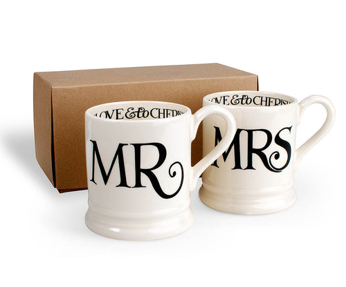 For better, or worse, for richer, or poorer, in sickness and in coffee or tea shortages. Never forget those sacred vows with the Black Toast Mr. and Mrs. ½ Pint Mugs from Emma Bridgewater. The perfect gift for just married lovebirds, the 50-year-old couple or everyone in between. Dishwasher safe; lower temperature wash and liquid detergent preferred to maintain appearance. Microwave use not recommended. Pottery is not oven safe unless marked as cookware. Bridgewater Pottery is made in England in the small Victorian English town of Stoke on Trent. Each piece is hand painted, hand finished and unique-- imperfections are part of the charm!