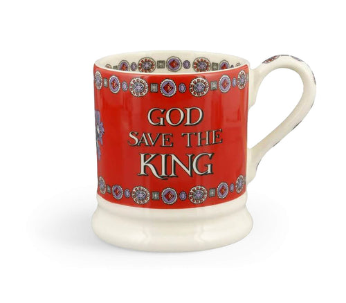Raise a toast to royalty with the limited edition 'Good Save the King 1/2 Pint Mug' by Emma Bridgewater Pottery. Handmade with care and featuring a beautiful red lithograph design, this exquisite ceramic mug is a unique tribute to the coronation of King Charles III. The mug's exceptional quality, handcrafted touch and classic design make it a true collector's item, perfect for any royal memorabilia collection. With its generous 1/2 pint capacity, it's the perfect size for enjoying your favorite hot beverage. Each mug is made using traditional techniques and finished with meticulous attention to detail, ensuring that every piece is truly one of a kind. With limited quantities available, don't miss this opportunity to own a piece of history.
